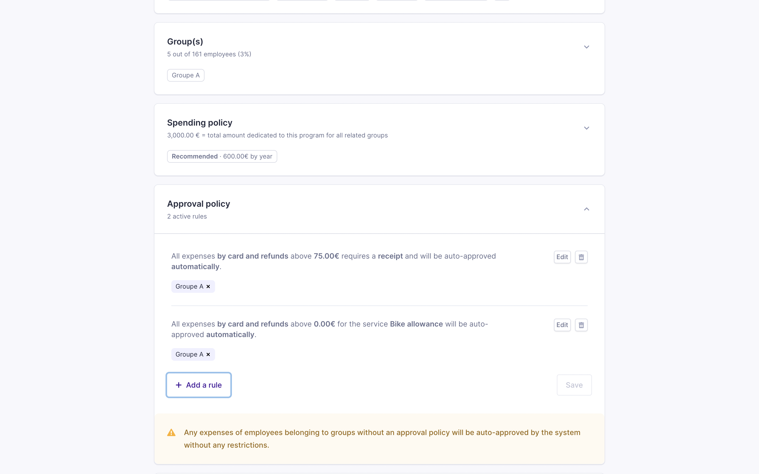 - Click on "Add a rule" and select to which employee groups this needs to be linked. Employees in this group will be subject to these approval rules