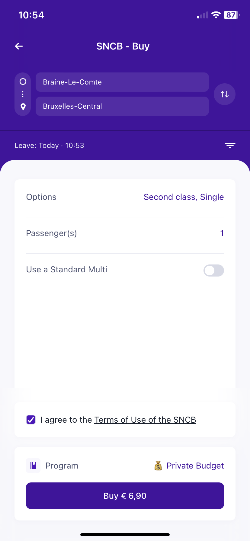 - Agree to the NMBS/SNCB Terms & Conditions and press "Purchase"