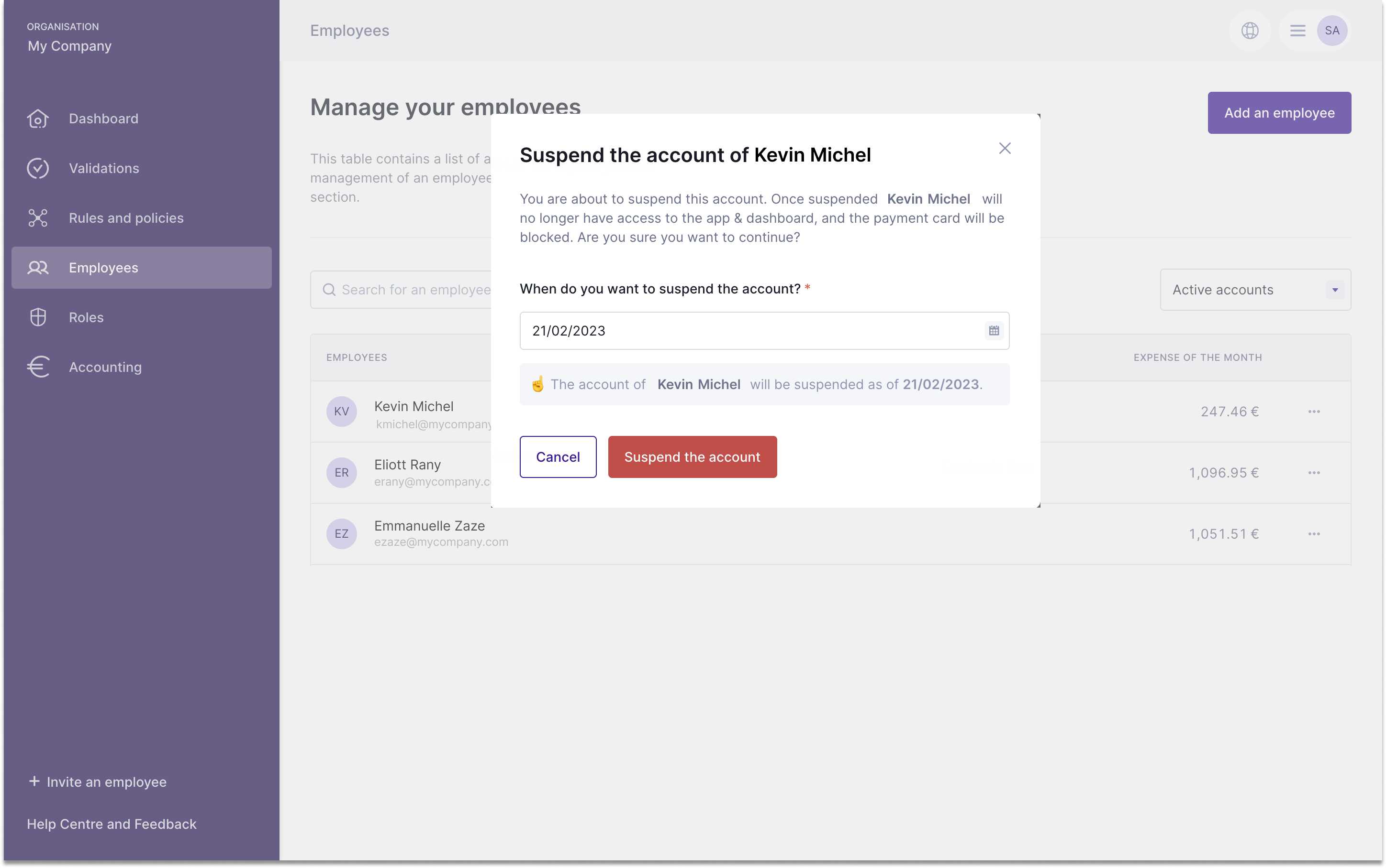 💡 Before suspending an employee, make sure to validate pending expenses, check that the budget is correct and reimburse the remaining amount (if relevant)