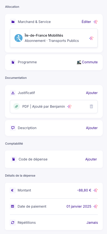 (Les champs remplis par le Scan IA seront marqués d’une icône ✨. Si le Scan IA ne parvient pas à extraire un détail particulier, le champ restera vide et devra être complété manuellement.)Une fois que tout est correct, soumettez votre dépense.