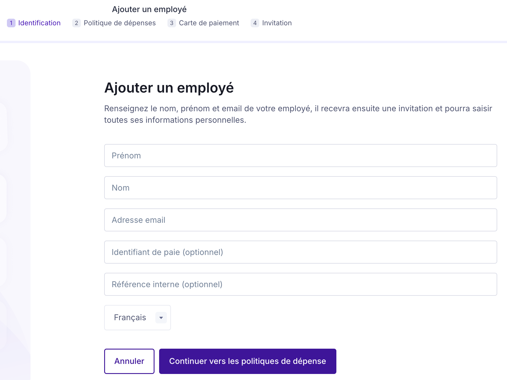 Complétez tout d'abord les informations personnelles de votre employé(e) : prénom, nom, adresse e-mail, numéro de téléphone portable, langue principale, numéro d'employé (si connu et utile pour vous).