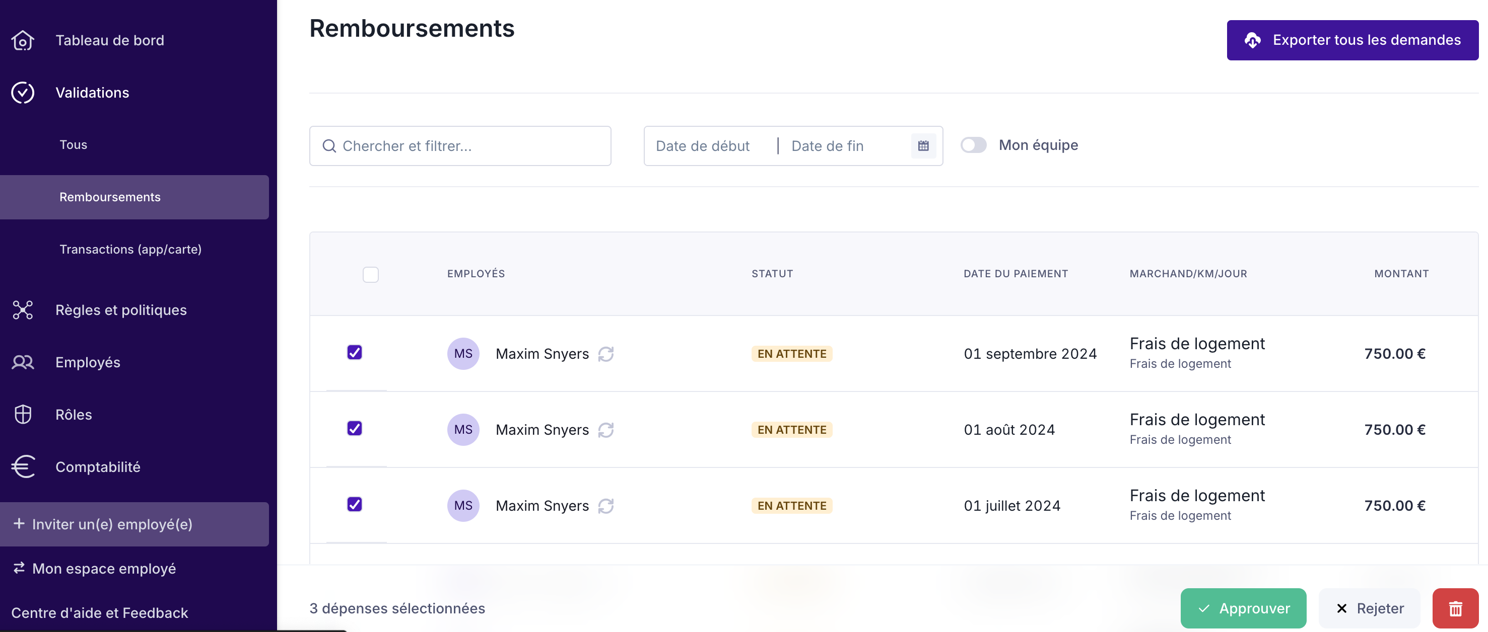 - Sélectionnez les dépenses que vous souhaitez valider.