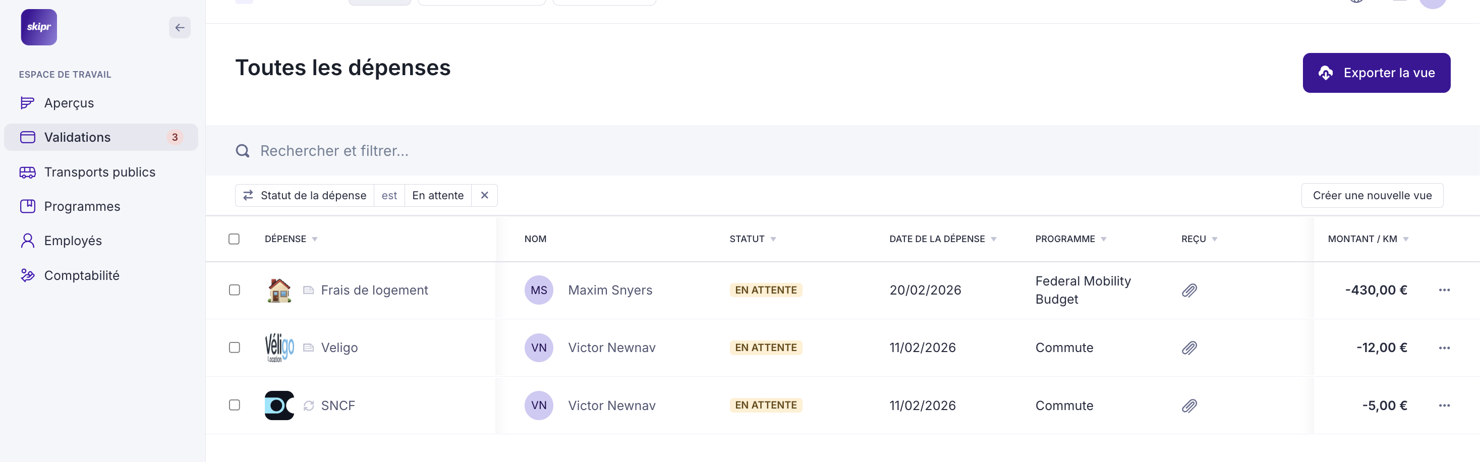 Pour consulter la liste des dépenses, cliquez sur "Validations". Il y a 3 vues distinctes :