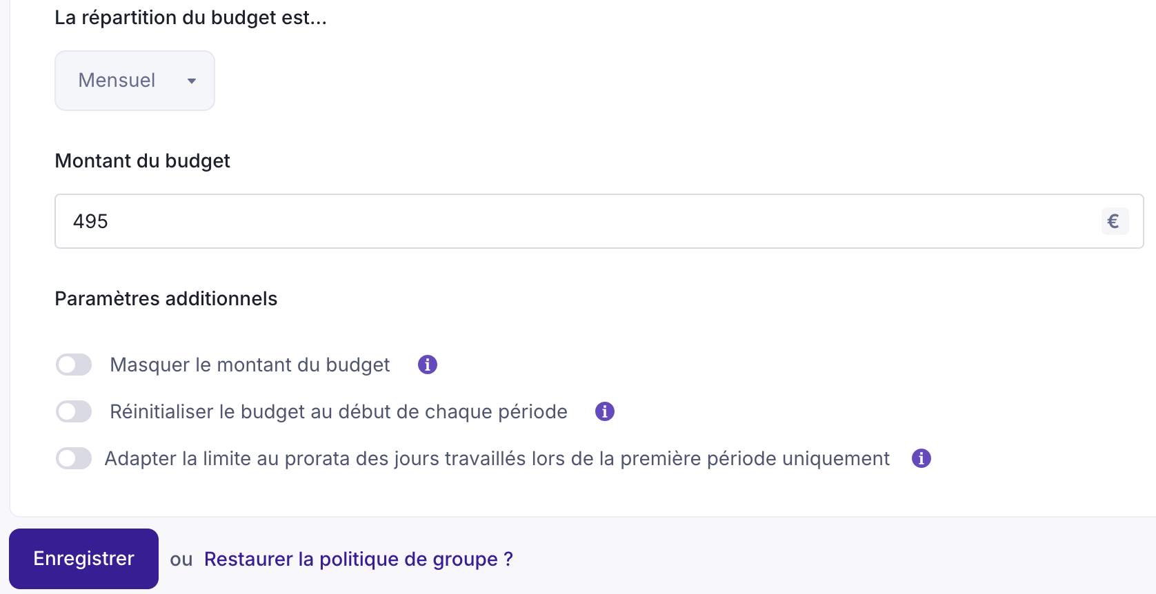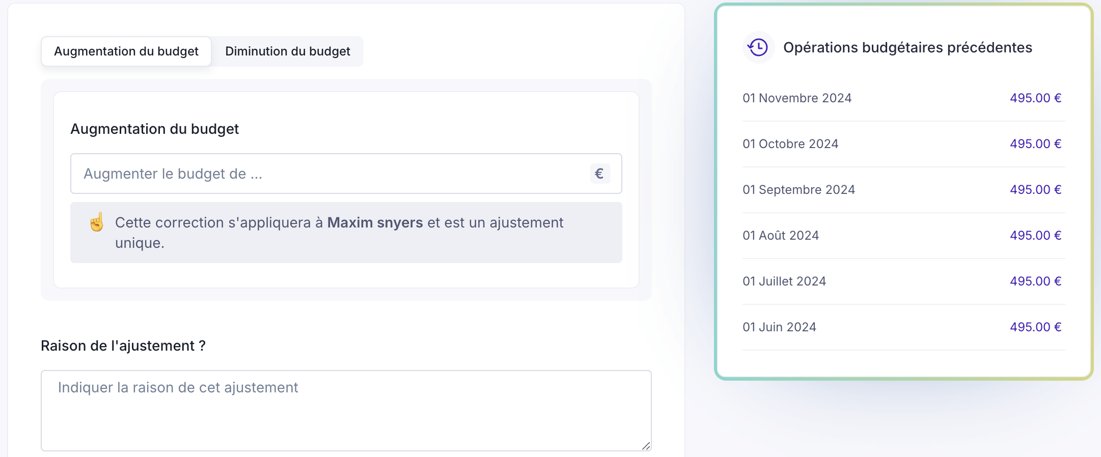 💡 Si votre modification impacte fortement le budget disponible de l’utilisateur, cela peut entraîner un budget négatif. Lors de l’enregistrement d’un changement entraînant un budget négatif, un message d’avertissement supplémentaire sera affiché