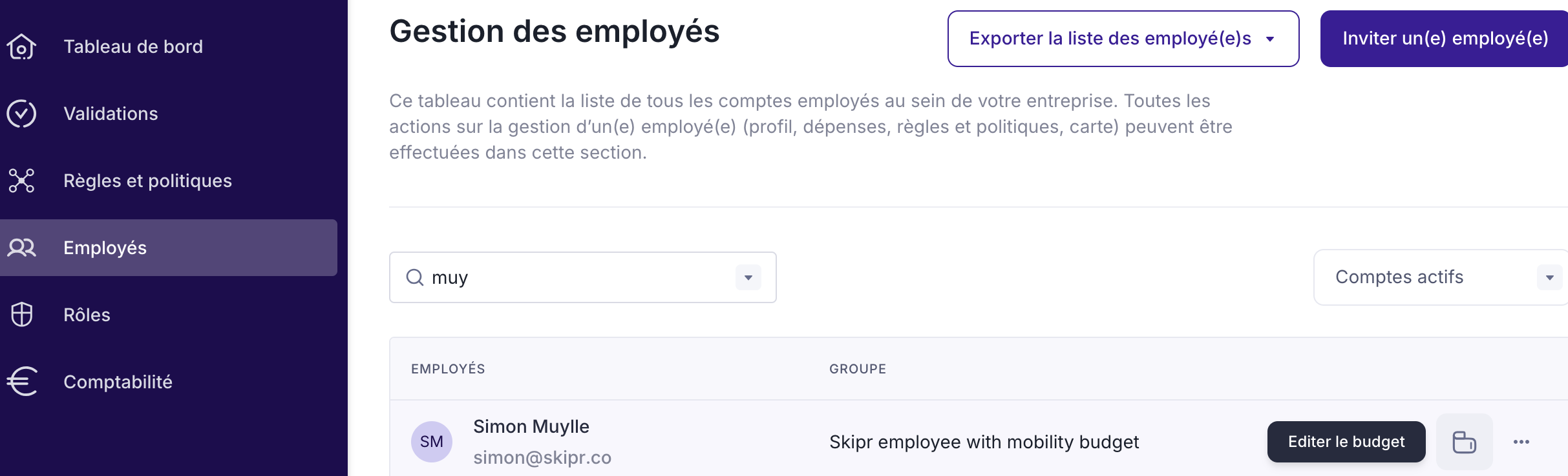 Pour modifier le budget d’un employé individuel, accédez à Employés et cliquez sur l’icône Editer le budget. À partir de là, vous pouvez :