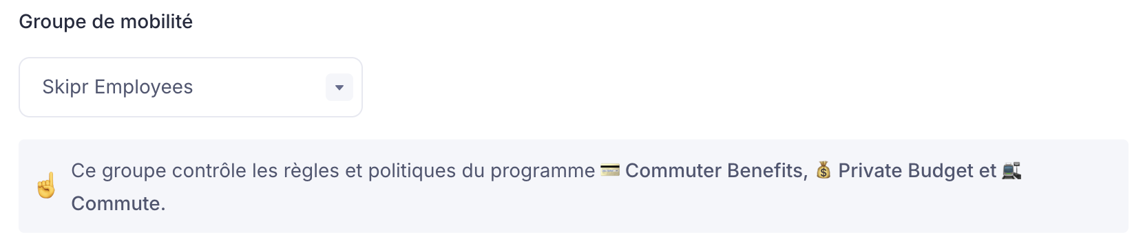- Si le nouveau groupe donne accès à un programme de mobilité différent, les modifications budgétaires seront appliquées à partir de la période de distribution en cours (mois, trimestre ou année).