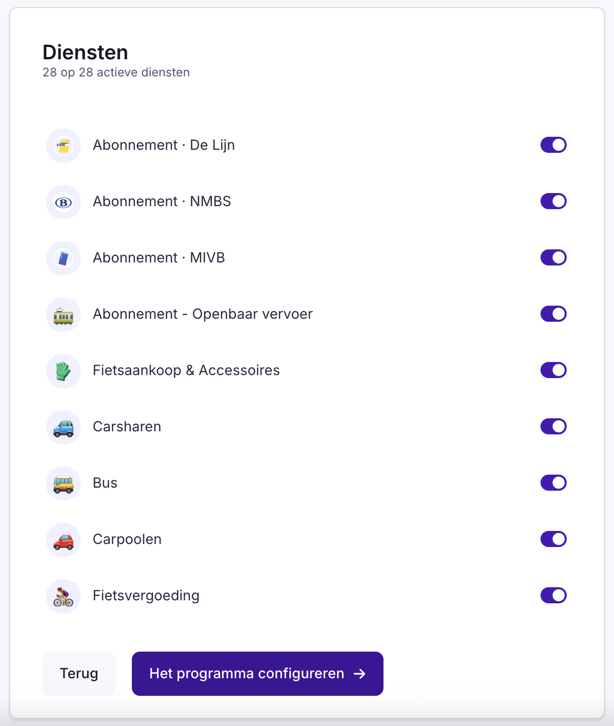 Je kunt de diensten inschakelen die je in het mobiliteitsprogramma wilt opnemen.