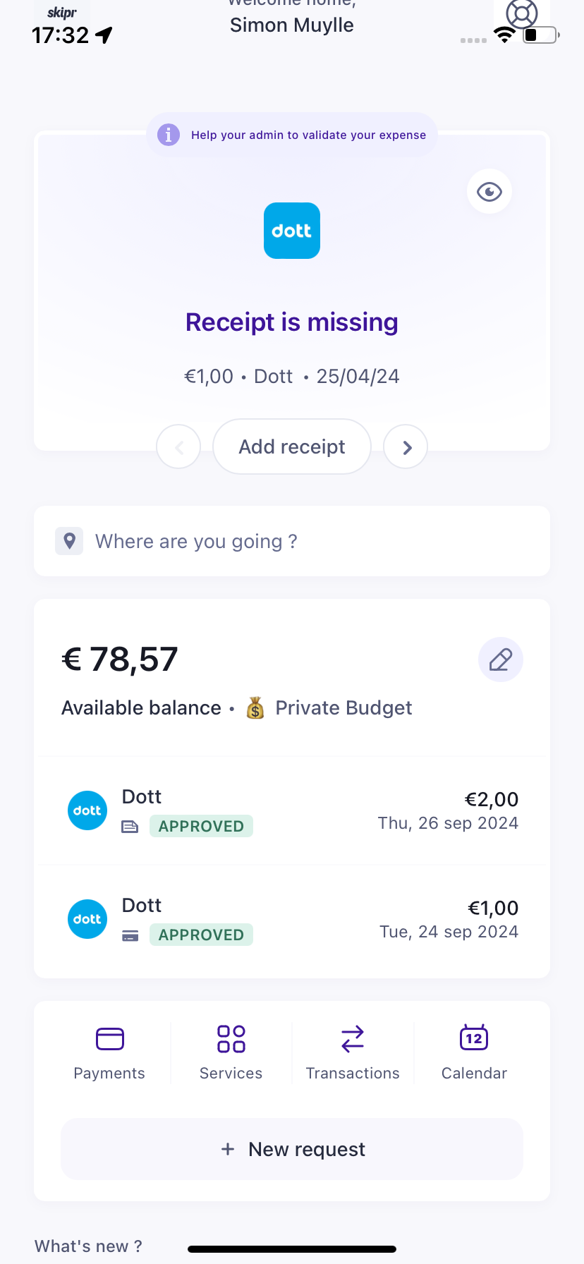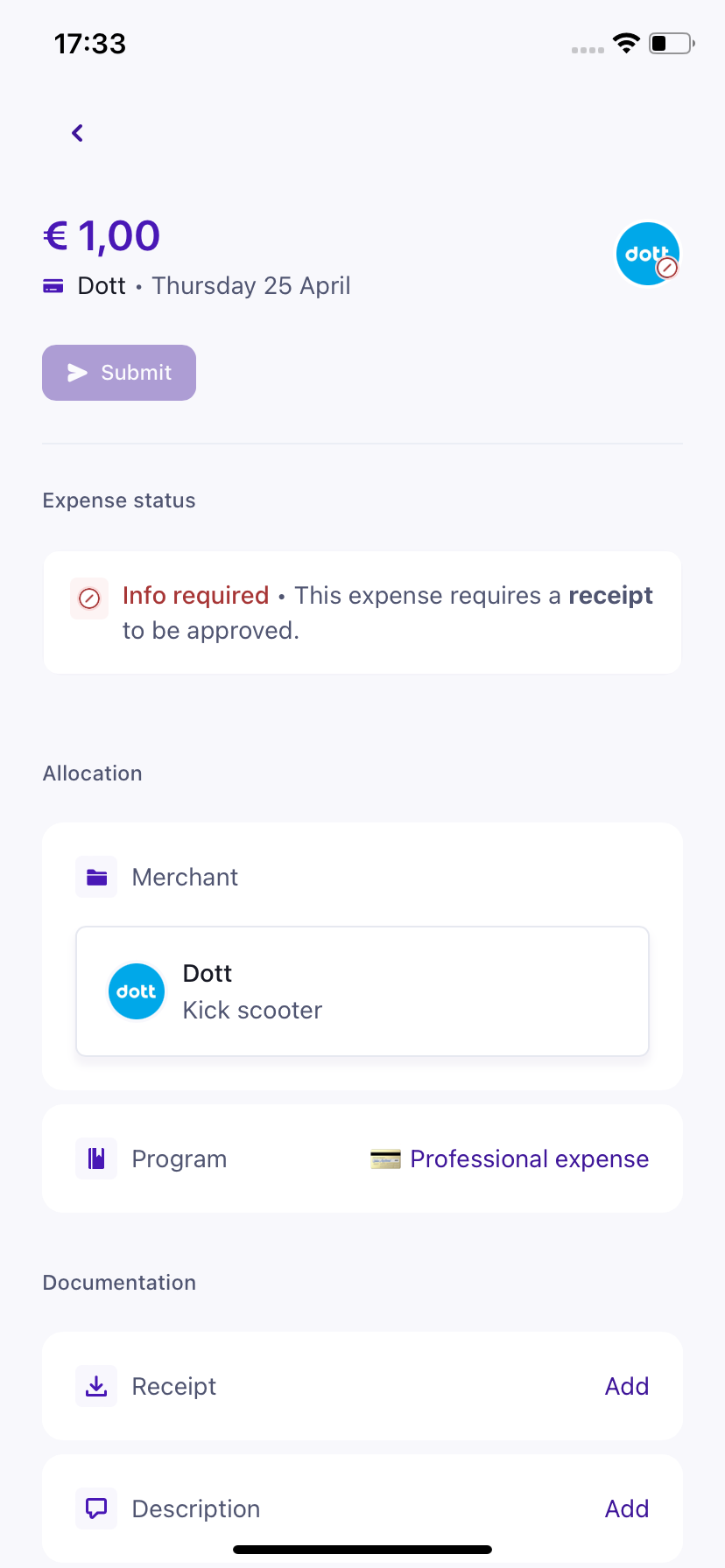- Skipr heeft extra informatie nodig om de uitgave correct te kunnen categoriseren. Sommige mobiliteitsproviders bieden bijvoorbeeld verschillende diensten aan (vb: Dott biedt zowel e-steps als deelfietsen aan)